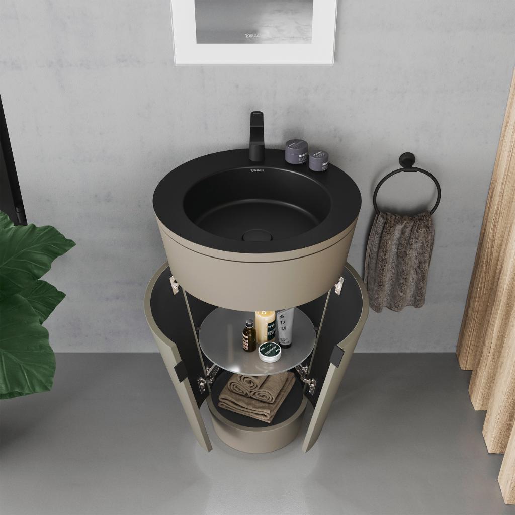 El toque final lo pone el tirador del mueble, disponible en cinco acabados diferentes, que redondea armoniosamente la reinterpretación. Además de los atemporales acabados en cromo y negro diamante, también están disponibles superficies de bronce cepillado y acero inoxidable, así como dorado de alto brillo. En combinación con griferías y accesorios seleccionados de Duravit, el resultado es un conjunto individual y armonioso.