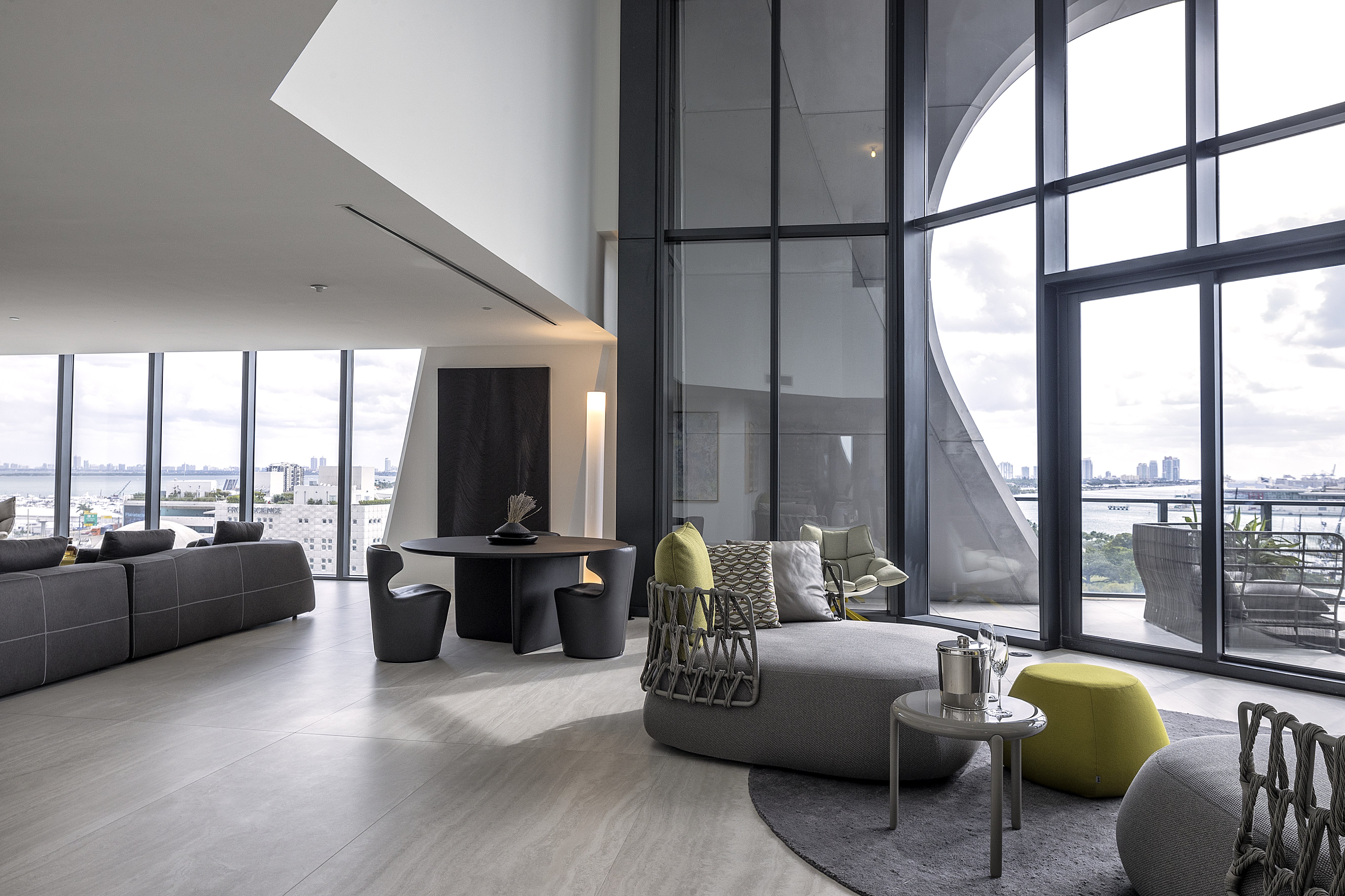 Como pieza central de una serie de cinco rascacielos, el One Thousand Museum de Miami, diseñado por Zaha Hadid, establece nuevos estándares en propiedades residenciales de lujo. El nombre «One Thousand Museum» hace referencia a su privilegiada ubicación en el número 1000 de Biscayne Boulevard, frente al Museum Park. Una característica destacada de esta obra maestra arquitectónica es la armoniosa mezcla de diseño futurista y elementos orgánicos por la que era famosa la arquitecta, fallecida en 2016. El aspecto más llamativo del edificio, de 216 metros de altura, es el exoesqueleto curvilíneo de hormigón blanco que serpentea intrincadamente alrededor del edificio y crea un interesante contraste con la fachada multifacética y cristalina. «El diseño expresa una fluidez que es a la vez estructural y arquitectónica», explica Chris Lepine, director de proyectos de Zaha Hadid Architects. «La estructura se hace más gruesa y más fina según las necesidades, aportando una continuidad entre la arquitectura y la ingeniería». El rascacielos, de 62 plantas, consta de un total de 83 apartamentos de lujo decorados al más alto nivel y ofrece unas vistas impresionantes del horizonte de Miami, la bahía de Biscayne y el océano Atlántico.