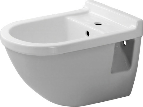 DURAVIT Starck 3 bidé suspendido de cerámica sanitaria, con rebosadero, con bancada para grifería. Forma rectangular parte delantera redondeada, canto posterior. Formas exteriores lisas y cerradas. Distancia libre al suelo 80 mm en caso de montaje a 400 mm. Dimensiones (an x prof x alt) 360 x 540 x 320 mm, Blanco, nº art. 2230150000