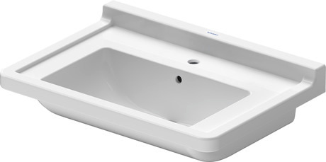 DURAVIT Starck 3 lavabo mueble de cerámica sanitaria con rebosadero. con espacio para depositar objetos a la derecha y izquierda. Lavabo de forma rectangular con borde de 40 mm de ancho y con agujero para grifería con opción a agujero para batería americana (indicar en el pedido). Opciones de montaje: semipedestal, pedestal o mueble. Con borde alrededor de 35 x 35 mm para evitar salpicaduras. Seno (an x prof) 480 x 305 mm. Dimensiones (an x prof x alt) 700 x 490 x 195 mm. Blanco, con 1 agujero hecho para grifería monomando, nº art. 0304700000, con 3 agujeros hechos para grifería americana, nº de art. 0304700030.